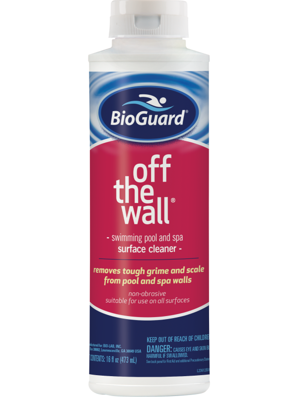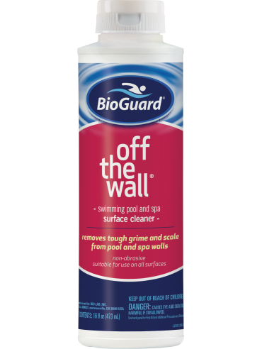BioGuard® Off The Wall® removes most stubborn scale, metal stains, grease and common dirt. This product clings to vertical surfaces for easy cleaning and may be used on plastic, vinyl, fiberglass, ceramic, stainless steel, aluminum, and painted surfaces. Unlike many household cleaners, Off The Wall® is compatible with swimming pool and spa water.