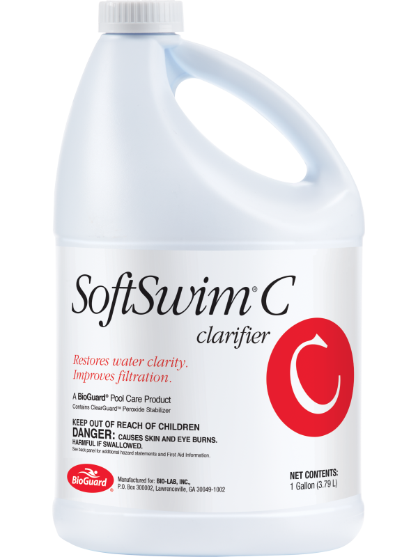 SoftSwim® C Clarifier is a unique, patented formulation for use in the BioGuard® SoftSwim® A, B, C Program which includes SoftSwim® A Algicide and SoftSwim B. Regular use of SoftSwim C® keeps water clear and sparkling.