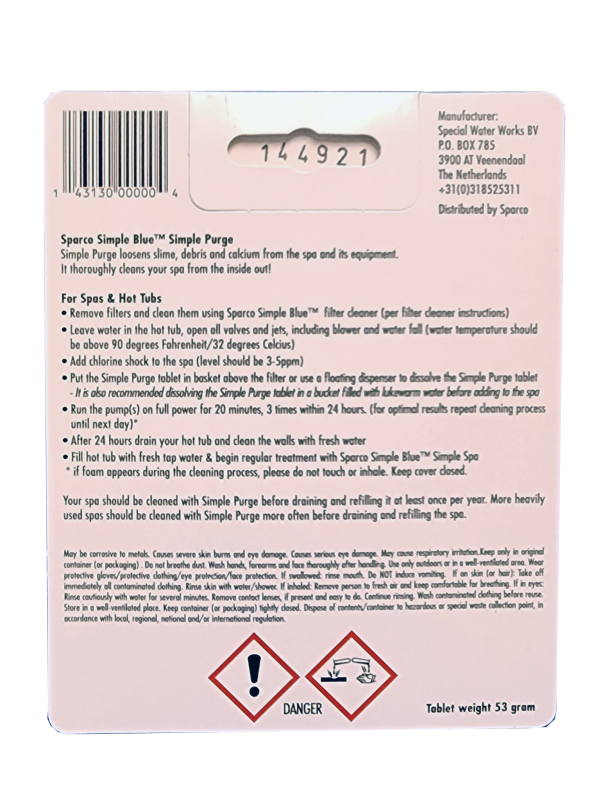 Sparco Simple Blue Simple Purge loosens slime, debris and calcium from the spa and its equipment. It thoroughly cleans your spa from the inside out!