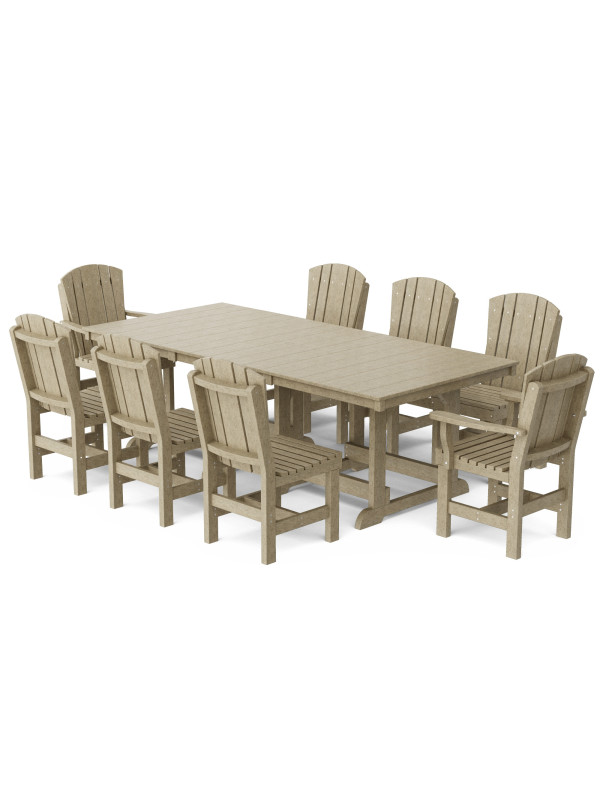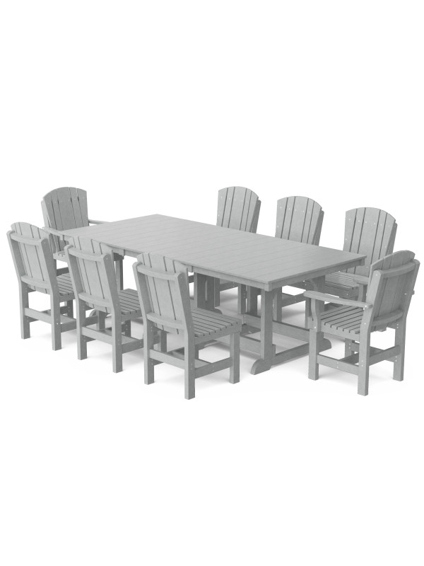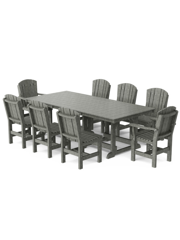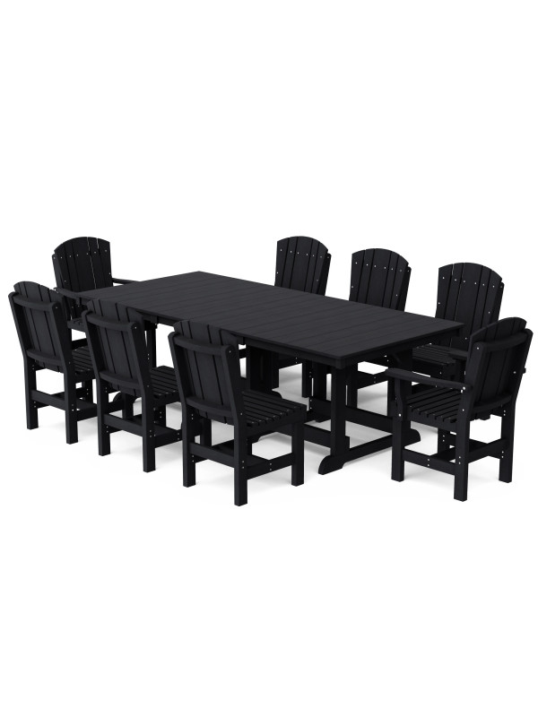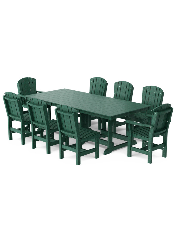 This traditional 9-piece outdoor dining set creates a welcoming space for family and friends to gather. This set includes (1) LCC-191 Heritage 44” x 94” Dining Table, (6) LCC-153 Heritage Dining Chairs, and (2) LCC-154 Heritage Dining Chairs with Arms. The rectangular shape provides ample space to comfortably seat eight guests, making it ideal for holiday meals, birthday parties, or casual barbecues. This set is constructed from recycled poly lumber and can withstand a range of climates including hot summers, rainy springs, and chilly winters. With built-in UV protection, it resists fading and maintains its vibrant color year-round.