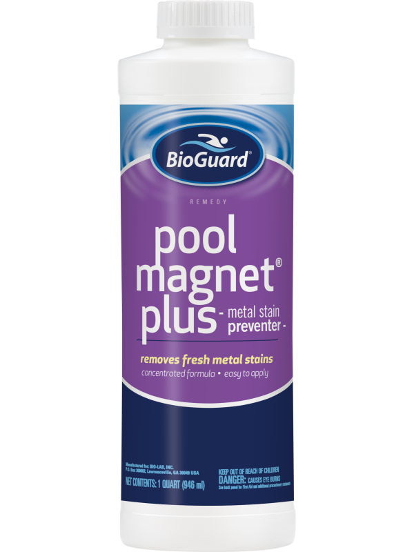 BioGuard® Pool Magnet® Plus is a concentrated chelating agent that ties up metals (iron, copper and manganese). This product removes fresh stains and prevents staining due to metals. Use this product monthly for swimming pools with metal containing fill water.