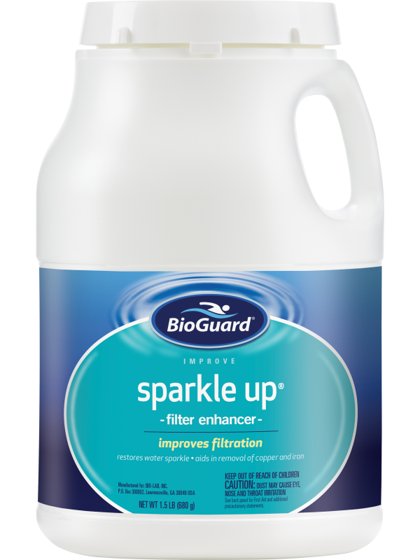 Tiny particles of suspended dirt, plaster dust, dead algae, pollen, etc. may pass right through the filter. BioGuard® Sparkle Up® will trap these tiny particles in the filter and will rapidly restore sparkle to cloudy water. This product contains no D.E. or alum. It will not affect the pH of pool water.